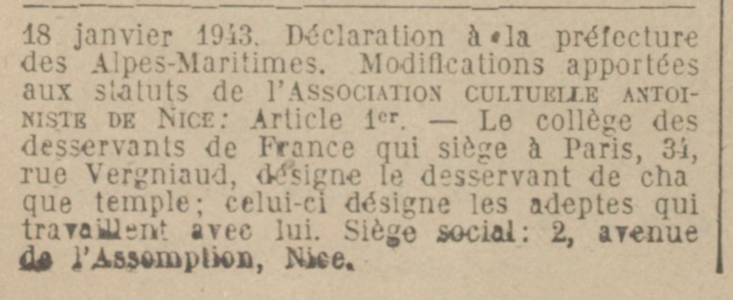 Là où se télescopent la rue Vergniaud et la rue Wurtz se dresse une chapelle lactescente au fronton de laquelle on peut lire : « 1913 culte Antoiniste », Rares sont les personnes qui savent à quoi correspond ce culte d'une exemplaire discrétion.