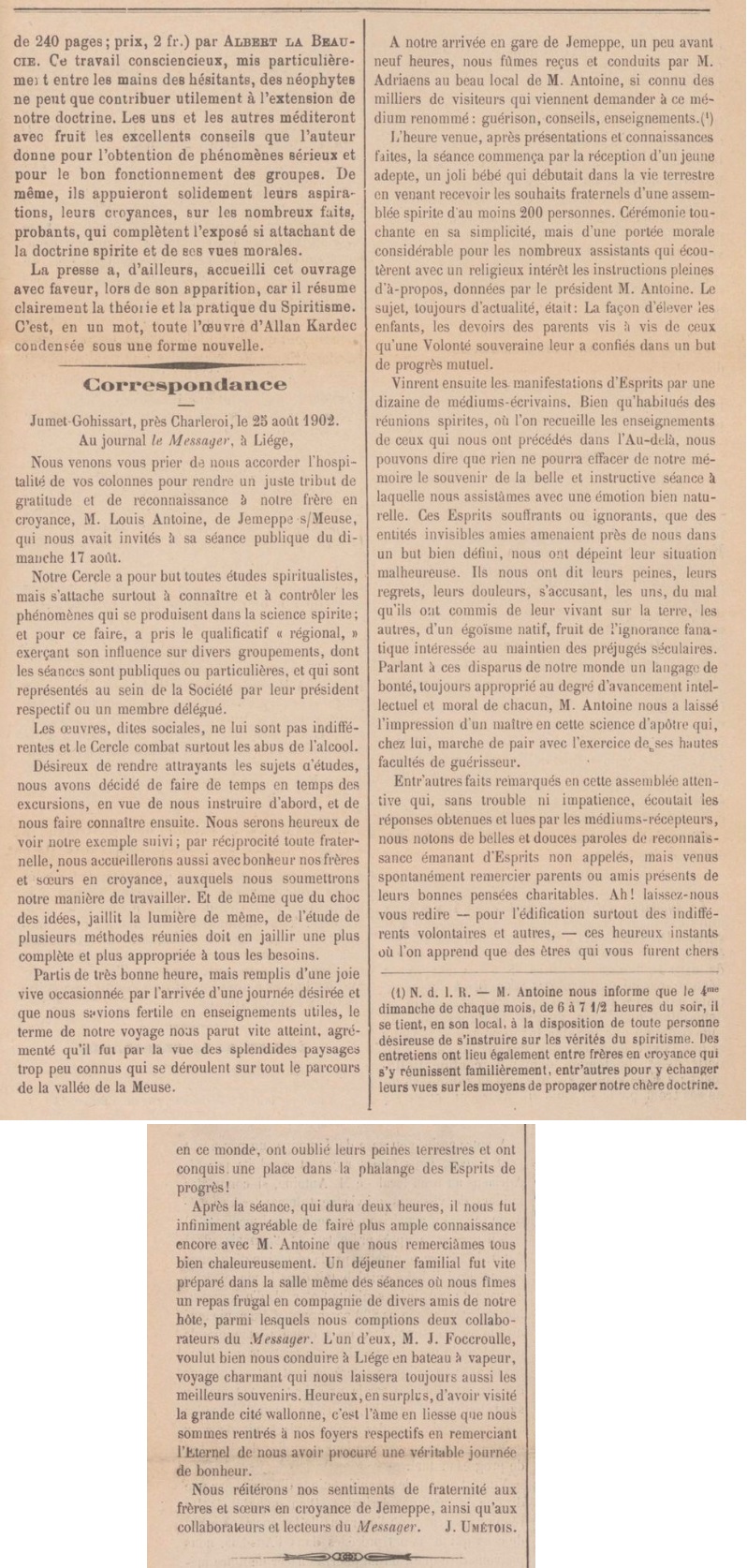 A notre arrivée en gare de Jemeppe, un peu avant neuf heures, nous fûmes reçus et conduits par M. Adriaens au beau local de M. Antoine, si connu des milliers de visiteurs qui viennent demander à ce médium renommé : guérison, conseils, enseignements.(1)